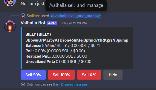 * Description: Lists all of your positions (token holdings), their current balance (in USD and SOL) and the PnL for each. Before listing tokens, it also syncs up the balance with your wallet's on-chain balance to make sure it is the same and always correct. You have the ability to sell the position (50/100%) or sell a custom % amount