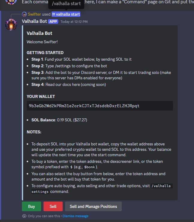 * Description: Get started with the bot. It displays your wallet address and balance, if you interact with the bot for the first time it will generate a wallet address for you and it will stay the same forever for the same account. The start command also includes button actions to buy, sell a token and list your positions.